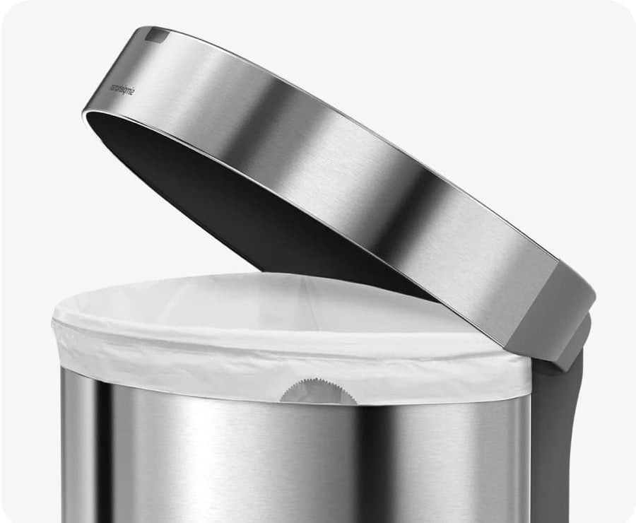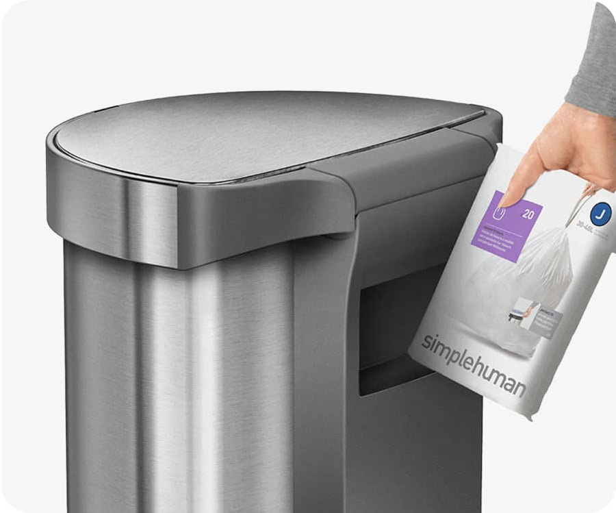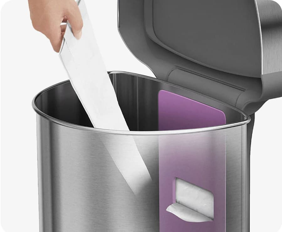 Rangez les sacs dans le compartiment, saisissez en un nouveau directement depuis l'intérieur de la poubelle, puis rabattez la bordure pour dissimuler le sac et le maintenir en place.