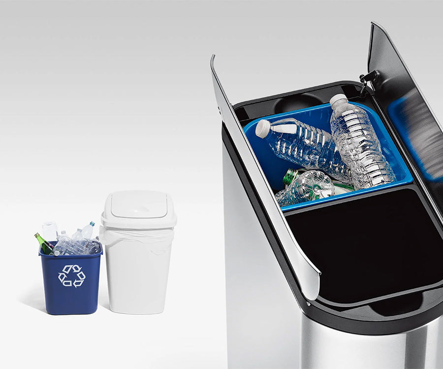 Triez facilement vos déchets et matières recyclables avec cette poubelle à deux compartiments. Un côté est réservé aux déchets, et l'autre aux recyclables. La poubelle allie respect de l'environnement et optimisation de l'espace.